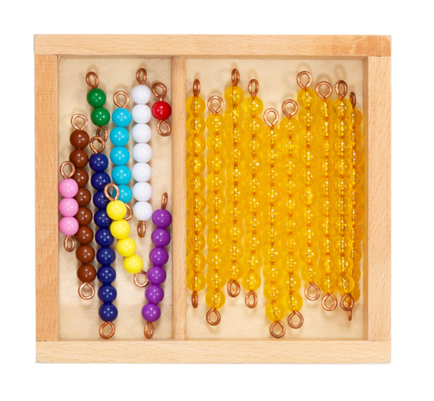 Ce set de barres de perles montées (8 mm), présenté dans sa boîte de rangement pratique, est un matériel Montessori idéal pour accompagner l’utilisation de la table de Seguin. Chaque barre est conçue dans une couleur distincte, permettant à l’enfant d’identifier visuellement les quantités et de les manipuler facilement.