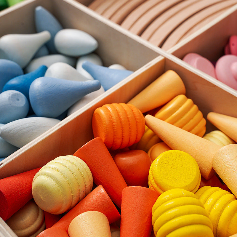 Stimulez la créativité et l’apprentissage des concepts spatiaux avec cet ensemble de 269 figurines en bois multicolores, accompagné de ponts et d'arcs-en-ciel.
