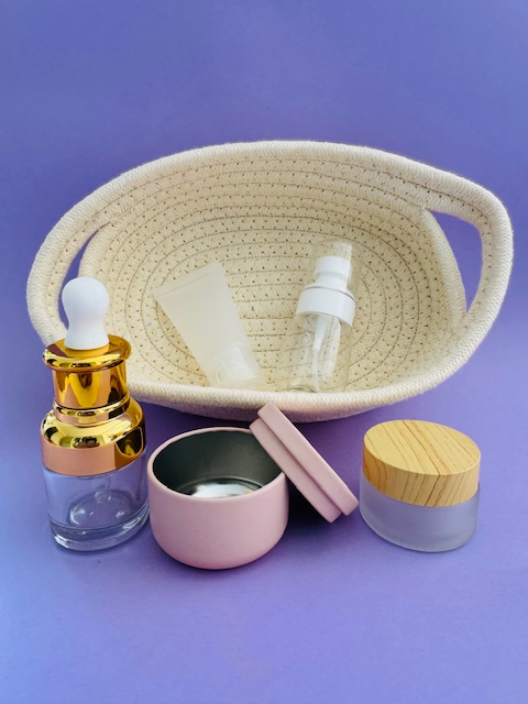 - Contenu : 5 flacons avec fermetures variées et panier de rangement